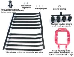 These frames and IDS linkages speed-up servo installation, keep the servo secure and rigidly mounted, and also allow easy removal for maintenance or replacement. The external bearing reduces side load at the servo output arm, reducing compliance and extending the life of the servo. The external bearing and the special rigid IDS pushrod reduces any free play, increasing the stiffness of the control surface, improving control and avoiding flutter problems.