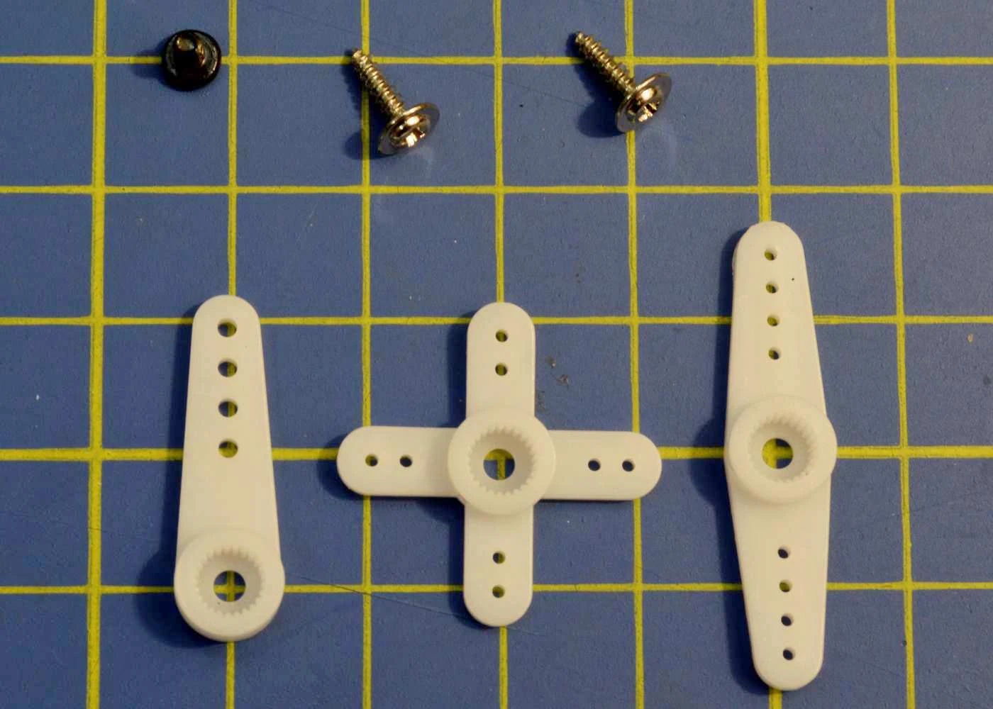 Contains three nylon output arms, one output arm retaining screw, and two servo mounting screws.